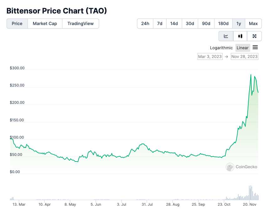 由价格趋势可以看到 $TAO 的价格从 2023 年 10 月末起经历了一次大幅上涨,推测其中主要推动力是包括 OpenAI 的发布会带来的新一轮 AI 热潮,使得资金板块轮动到 AI 板块。同时 $TAO 作为 Web3 + AI 赛道的新兴项目,其优秀的项目质量和长远的项目愿景也是吸引到资金进入的一大原因。然而不得不承认,同其他 AI 赛道的项目一样,虽然 Web3 + AI 的组合潜力巨大,然而其在实际业务中的应用还不足以支撑起一个长期盈利的项目。