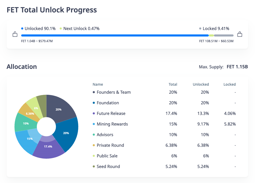 代币方面,$FET 作为 Fetch.ai 的原生代币,覆盖了网络内支付 Gas、质押验证和购买服务的常规作用。$FET 目前已经解锁了超过 90% 的代币,具体分配如下: