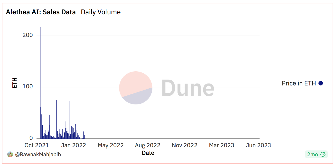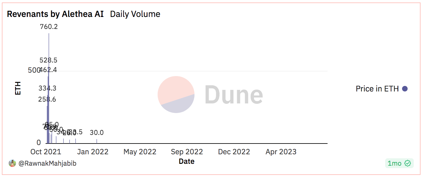 从 Dune 看板统计的数据我们可以看到,无论是出售给第三方的 Intelligence Pod,还是Alethea.ai 第一方发行的 Revenants collection,都在初始发行一段时间后逐渐销声匿迹。这其中的主要原因,笔者认为应该还是最初的新鲜感退去之后,没有实际价值或者社区热度留存用户的缘故。