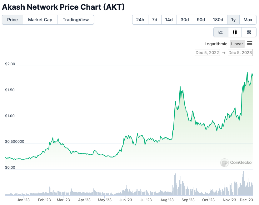 由 coingecko.com 上显示的价格趋势可以看出,$AKT 的价格在 2023 年 8 月中旬和 11 月下旬也分别迎来一次上涨,但仍不如AI赛道中其他项目的同期涨幅,这可能和当下的资金情绪倾向有关。总体来看,Akash 的项目作为 AI 赛道的几个优质项目之一,基本面优于绝大多数 AI 赛道的竞争者。其潜在业务收入有可能为协议未来盈利带来机会,随着 AI 产业的发展和对于云计算资源的愈演愈烈,相信在未来有望看到 Akash Network 在下一个 AI 大浪潮中扶摇直上。