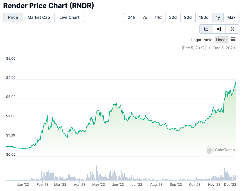 由于Render 是自主研发了高性能渲染器 Octane Render 的 OTOY 公司,加上确定的商业逻辑,所以上线之初就被认为是自带需求和基本面的 Web3 项目。在生成式 AI 风靡的这段时间里,需求大幅增长的分布式验证和分布式推理任务完美契合 Render 本身技术架构,也被认为是其未来值得期待的发展方向之一。同时 Render 近些年常年占据 Web3 领域 AI 赛道的龙头位置,已经衍生出了一定程度的 meme 性质,每次有 AI、元宇宙、分布式计算等叙事热潮时总能吃到上涨红利,可谓是较为全能了。