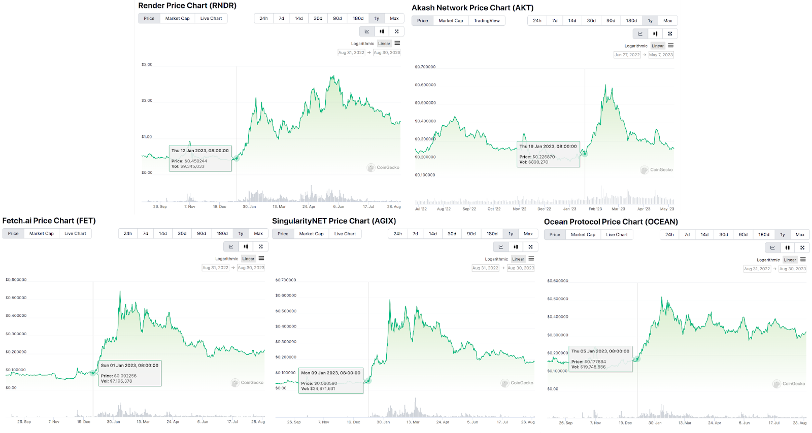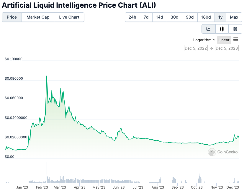 从 $ALI 的用例可以看出,目前此代币的价值捕获还停留在叙事层面,从一年内的币价变化也可以印证这个推论:$ALI 吃到了从 2022 年十二月开始的 ChatGPT 引领的生成式 AI 热潮红利。同时在今年六月,Alethea.ai 公布上线最新的 Open Fusion 功能时,也带了一波上涨。除此而外,$ALI 的价格一直处于下降趋势,连 2023 年末的 AI 热潮也未能驱动价格上升程度至同赛道项目上涨的平均水平。