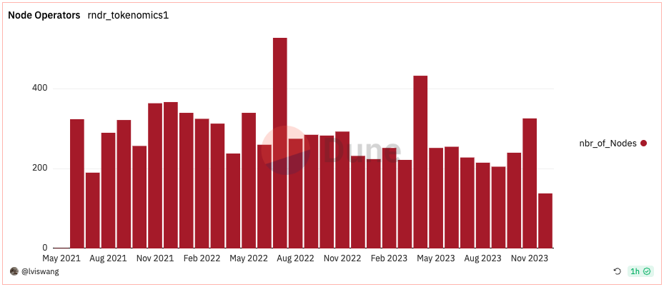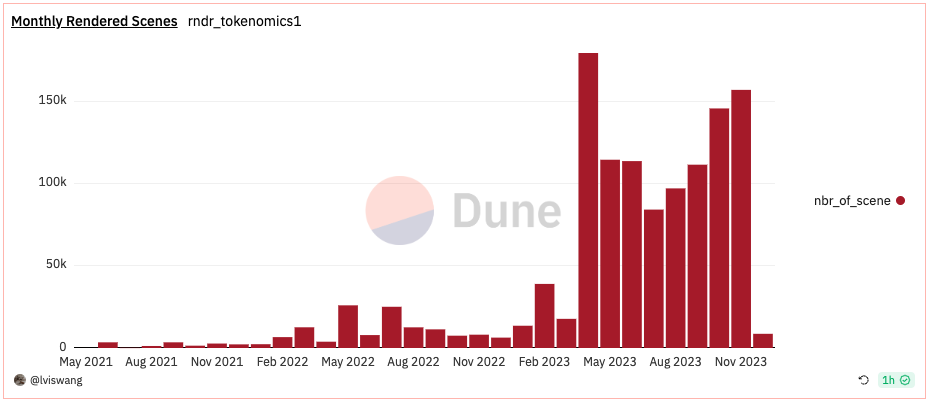 同时从 Dune 数据看板可以看到,自 2023 年年初以来,总的渲染任务数量增加,但是渲染节点并没有增加。说明增加的用户都是有渲染需求的用户(而非有渲染资源的),结合 2022 年末的生成式 AI 热潮,合理推断增加的渲染任务都是生成式 AI 相关的任务。目前还很难说这部分需求是否是长期需求,还需要后续观察。