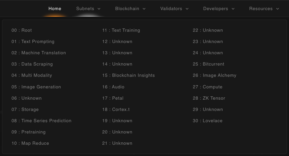 需要注意的是,在绝大多数子网中,Bittensor 本身并不训练任何模型,其发挥的作用更像是链接模型提供者与模型需求者,并在此基础上更进一步的利用小模型之间的互相作用提升在不同任务中的性能。目前已经上线(或曾经在线)的子网已经达到 30 个,分别对应不同的任务模型。