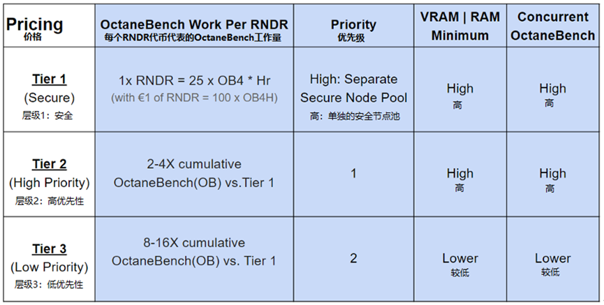 Render Network 发布的新的定价分级制度将链上的服务分为了三个档次,由高至低分别对应不同价位和质量的渲染服务,可以由渲染需求方自行选择。