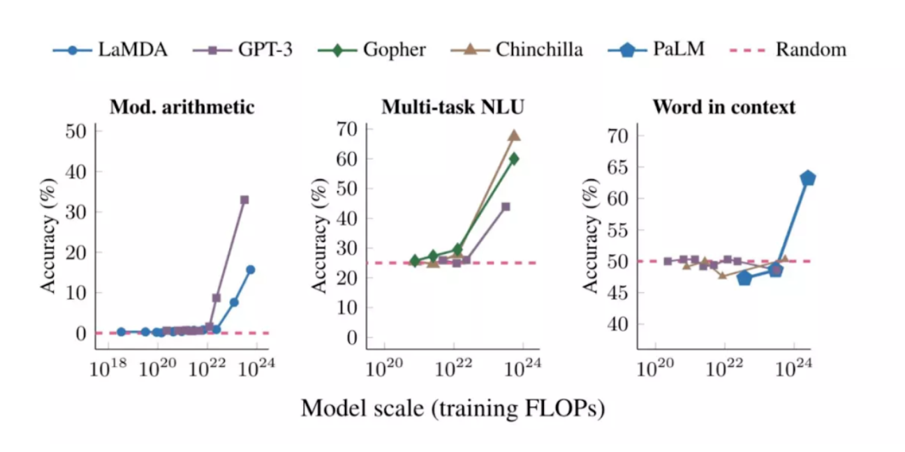 数据在未来 AI 发展领域是建立技术壁垒的核心。为了理解其重要性,我们先来看一项关于大模型性能来源的研究。这项研究表明,AI 大模型展现出一种独特的涌现能力:即通过不断增加模型规模,当超过某个阈值时,模型精度会突然暴增。如下图所示,每张图代表一个训练任务,每条折线达标一个大模型的性能(准确率)。各种不同的大模型上的实验均获得了一致的结论:模型规模超过一定阈值之后,在不同任务上的性能都表现出突破式增长。