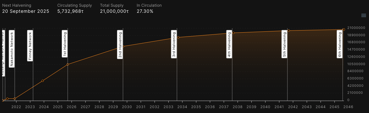 $TAO 作为 Bittensor 的原生代币,作用包括创建子网,在子网中注册,支付服务,向验证者质押等等,在生态系统中发挥着举足轻重的作用。同时由于 Bittensor 项目方致敬 BTC 精神的做法,$TAO 选择了公平启动,即所有代币都会通过在网络中做出贡献产生。目前,$TAO 的每日产出约为 7200 个,平均分配给矿工和验证者。自项目启动始已经产出的总量约为 2100 万的约 26.3%,其中 87.21% 的代币被用于质押与验证。同时项目设计了约 4 年一次的产量减半(和 BTC 相同),最近的一次会发生在 2025 年 9 月 20 日,这也将是驱动价格上涨的一大动力。