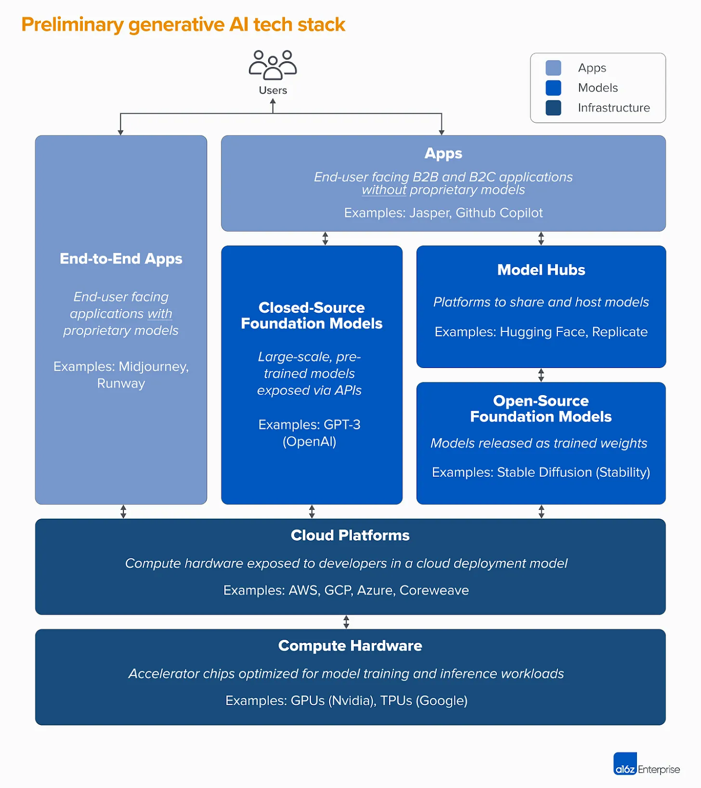 很多过往的优秀文章都从不同角度讨论过了生成式 AI 对已有技术构架的意义,比如这篇来自A16z 的文章《谁拥有生成式 AI 平台?》,其中全面总结了生成式AI目前的技术构架:
