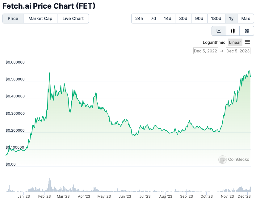 从项目启动以来,Fetch.ai 已经以稀释代币持有的方式接受过多轮融资,最近一次是 2023 年 3 月 29 日,Fetch.ai 接受了来自 DWF Lab 3000 万美元的融资。由于 $FET 代币并没有项目收入方面的价值捕获,所以价格提升的驱动力主要还是来自于项目更新和市场对于 AI 赛道的情绪。可以看到,借着 AI 板块的两次热度,Fetch.ai 的价格在 2023 年初和 2023 年底均有一次超过 100% 的价格飙升。