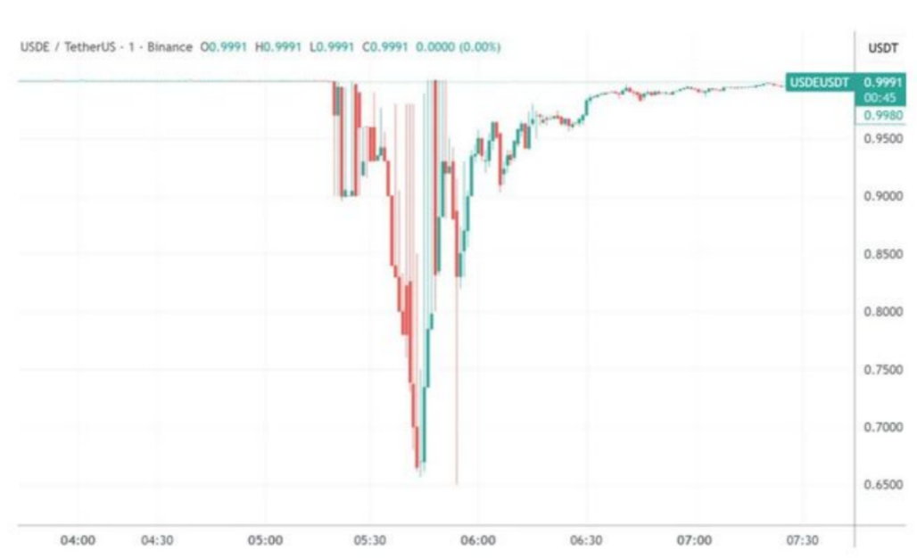 10 月 11 日的脱锚事件让市场短暂从强势落地的节奏中抽离出来。USDe 在宏观情绪下探至 0.60 美元,随后 11 月初,多条 DeFi 资金池出现连锁性失衡,稳定币价格的轻微偏离与主流加密资产的回调共同形成了一次小型冲击。这是一场剧烈但典型的 「链上压力测试」 ,验证的是系统在高波动环境下的承压能力。