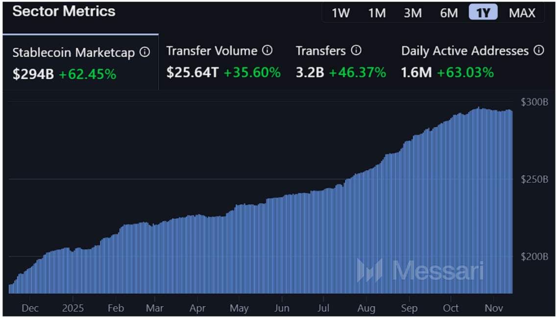 链上数据同样展示了稳定币市场的成熟面貌。Messari 的追踪显示,过去一年稳定币链上转移规模超过 25 万亿美元,累计转账笔数突破 32 亿,活跃地址达到 160 万,增幅均在 30%–60% 区间。这些增长并非由投机推动,而是来自跨链清算、交易所结算、企业付款、链上托管与跨境汇款等真实场景——每一类都属于高频、刚需、可持续的价值传递需求。