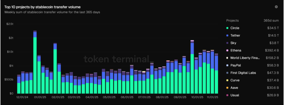 TokenTerminal 的数据进一步揭示了结构性变化:过去一年 Circle 的稳定币转账量高达 34.5 万亿美元,远超其他竞争者,Tether 以 14.5 万亿美元紧随其后。从周度趋势来看,9 月之后链上活动显著抬升,恰好对应监管落地、企业采用加速后的阶段性增长。