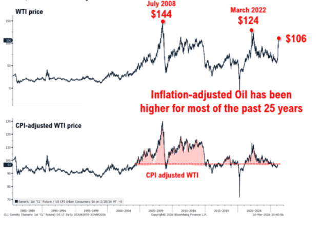 换言之,当前的 100 美元油价,在通胀调整后仍低于本世纪以来的均值水平。