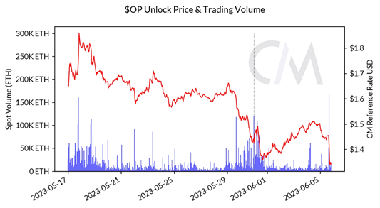 Optimism是以太坊的第二层扩展解决方案,最近(2023年5月31日)有一个约3.87亿OP的代币解锁,相当于3.96亿美元,几乎是目前流通供应量的60%。我们从下面的交易量可以看出,在代币解锁之前有一段时间的高交易量活动,以及看跌的价格行动。