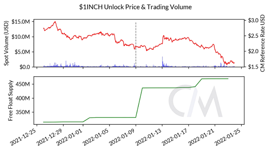 1美元INCH最早的一次大解锁发生在2021年12月,预定的约2亿枚代币的归属被释放给团队和投资者。下面的上图显示了Coin Metrics的参考汇率和1INCH的报告现货量,下面绘制了自由浮动供应。现货量和价格在解锁前都迅速增加,几天后价格下跌。