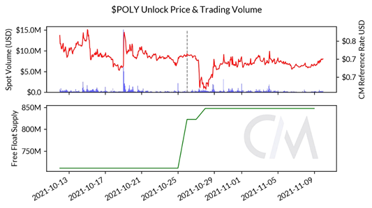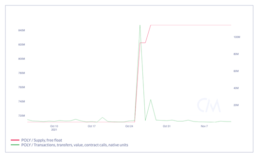 在这第一种情况下,Polymath代币的自由浮动供应量大量增加,超过137M的POLY供应量被添加到流通中。然而,似乎并没有多少交易量在交易所进行交易。如果我们转而看看其他链上指标,我们可以看到大量的交易发生在链上,如下图所示,这意味着这可能不是由于代币解锁。事实上,我们发现Polymath的新CEO正是在这一天宣布的。