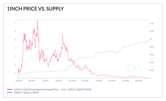 鉴于该代币早在2020年推出,有大量的价格历史可以分析。下图显示了自由流通量供应的进展和1INCH美元迄今为止的价格历史。