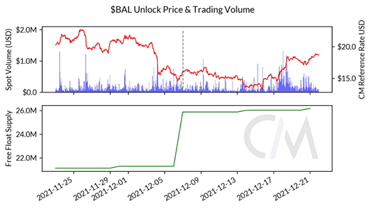 BAL是一个有趣的截图,因为这种浮动供应的变化并不像UMA那样是由于代币的归属时间表(因为BAL有一个线性归属时间表)。然而,约400万BAL的供应量变化高于2021年12月前给予创始人和早期投资者的约210万BAL。在这种情况下,我们看到价格影响很小,而且围绕着供应量的变化也没有多少成交量的聚集。