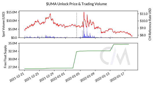 UMA是一个代币的案例,自由流通量指标的上升是对早期投资者获得其锁定的代币作为2年归属时间表的一部分的反应,所以没有必要检查其他混淆性的解释。值得注意的是,在这种情况下,UMA的交易量在各交易所中出现了很大的波动,这是在供应解锁之后出现的,价格波动也很大。