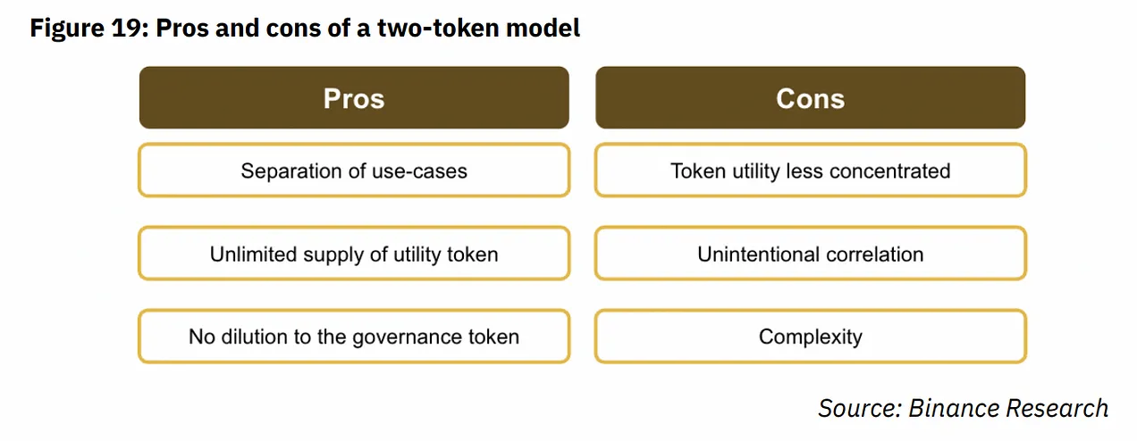 一些项目可能会引入两个甚至三个代币的模式来分离不同代币的功能。在大多数双代币模式的情况下,我们有:
