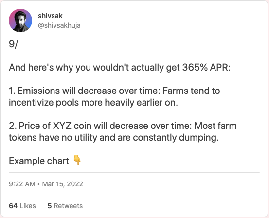 这就是为什么承诺令人难以置信的APY的协议从长远来看注定会失败的原因:他们必须不断铸造新的代币来奖励质押者,但这样做会增加销售压力。代币的价格取决于协议中的新来者,一旦这种流入停止,代币将自由下跌。