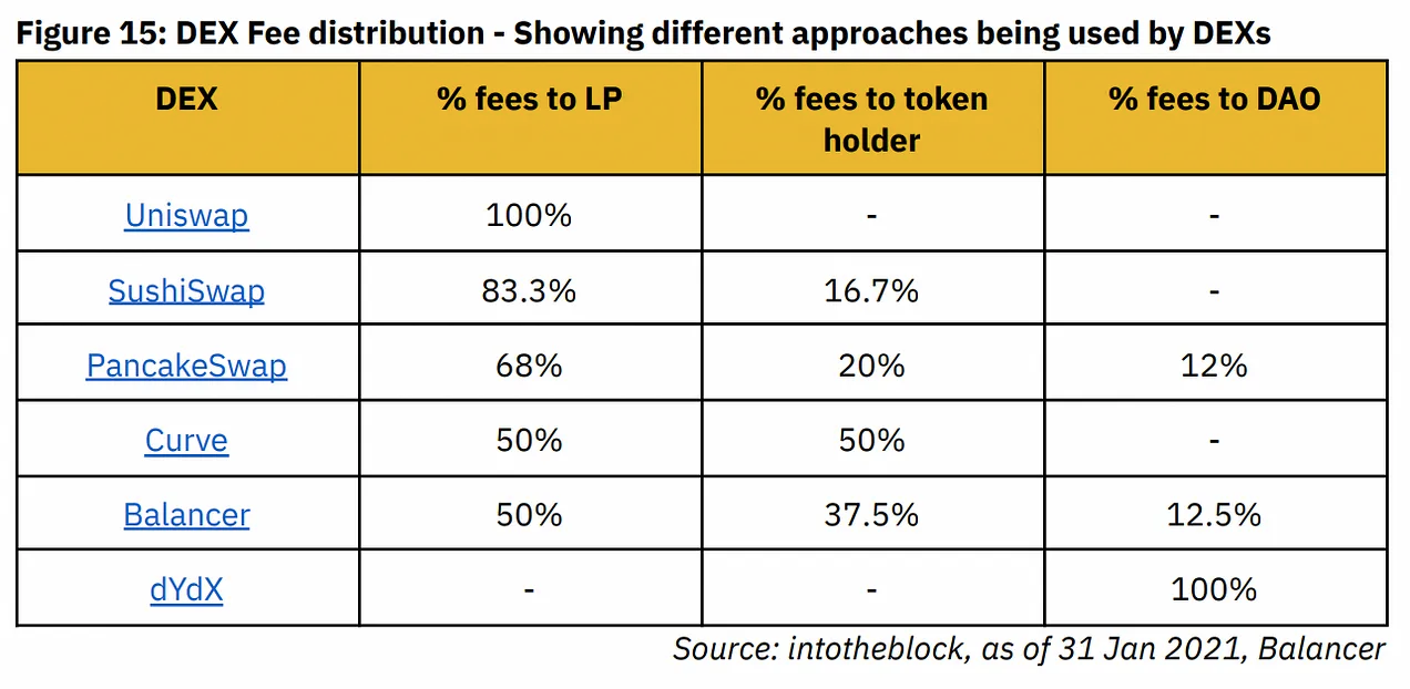 众所周知,Uniswap不与代币持有人分享费用的百分比。另一方面,Curve与代币持有者分享的费用比例要高得多。这些数据不是最近的,因此可能已经发生了变化,但这个图表有助于显示DEX使用的不同方法。
