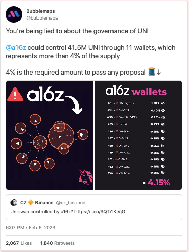 然而,将治理权赋予代币持有者会引发中心化和衡量投票的适当方式方面的问题。如果一个代币就是一票,那么去中心化协议中的治理必然会向大股东和鲸鱼倾斜。最近Uniswap治理的情况就是这方面的一个例子,用户发现a16z控制了超过4%的$UNI供应,这是通过治理提案所必需的法定人数。