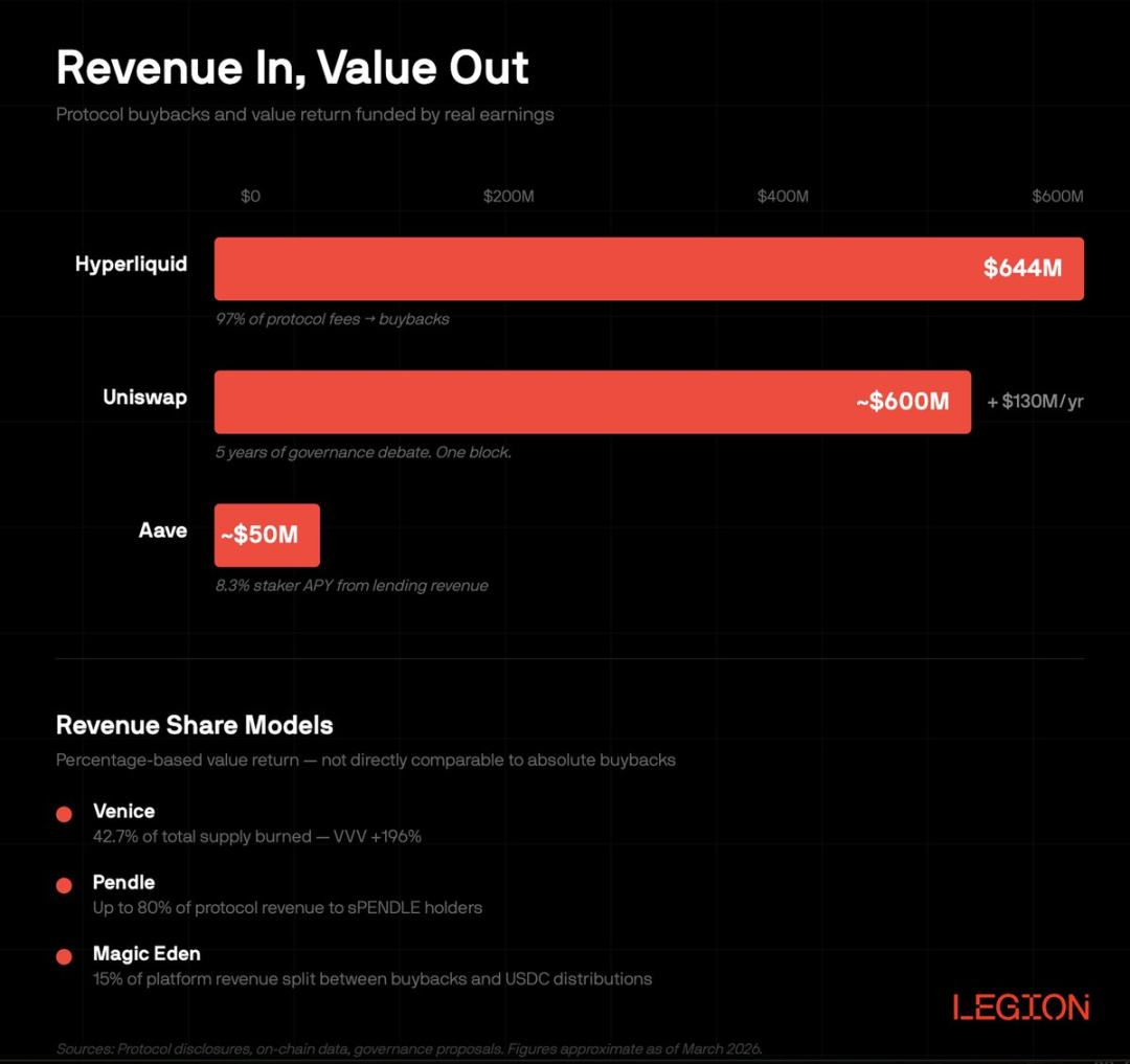 而真实营收时代扭转了全局格局。Hyperliquid、Aave 等项目将价值回馈与真实业务盈利深度绑定:协议营收入账→启动代币回购;手续费收益沉淀→分红发放给质押持有者。