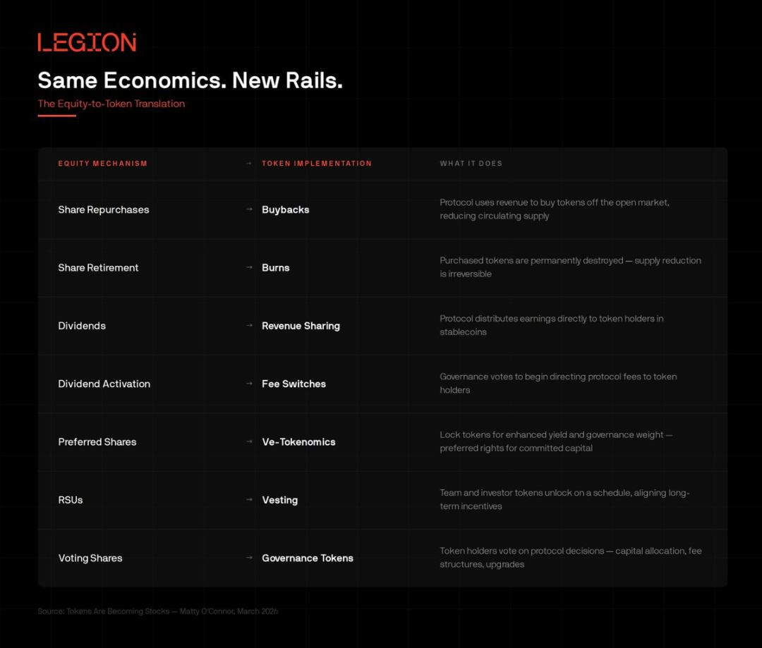 回购销毁、收益分红、费用开关、归属解锁计划、优先股转普通股…… Web3 项目正在全面复刻这套金融逻辑,所有结算实时完成,任何人通过区块浏览器均可公开查验。经济模型从来不是创新核心,底层基础设施才是关键。股权运行逻辑久经验证;真正变革的是承载这套逻辑的流转通道,这直接改变了资本准入门槛、结算速度与运行透明度。