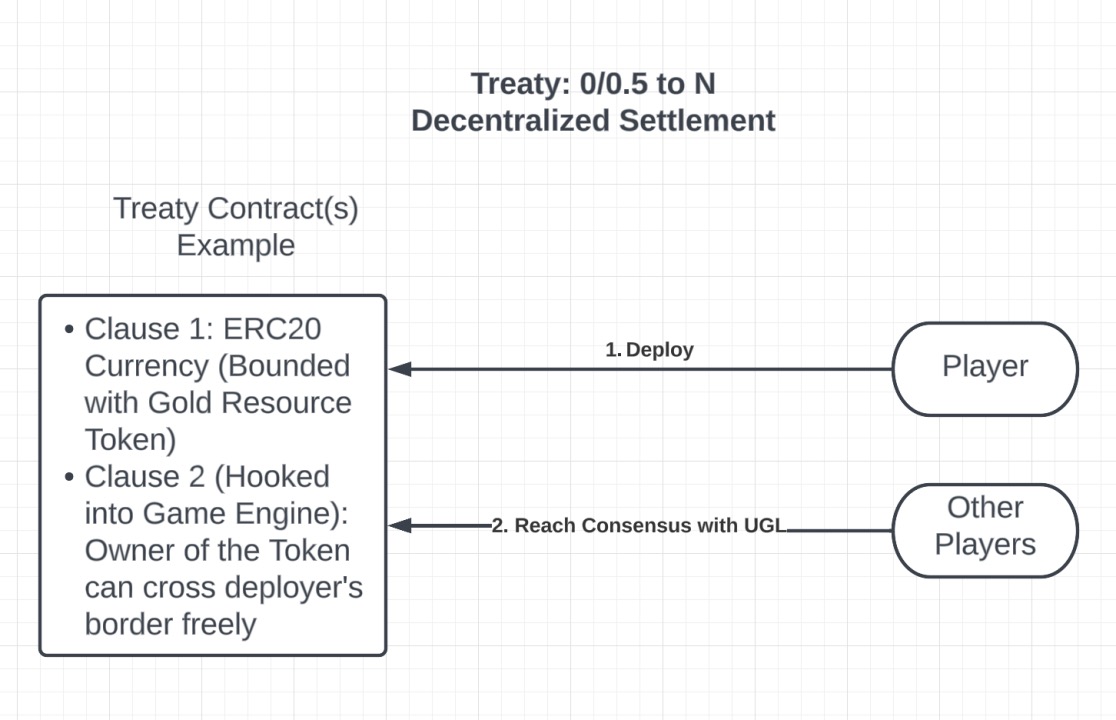 我们相信,Treaty通过允许玩家在智能合约中通过用户生成逻辑(UGL)在游戏规则和机制的基础上进行构建,开辟了游戏设计的新领域。这使得玩家可以在游戏中部署不同的共识模型。这些模型超越了传统的游戏物理学,使玩家能够将他们的协议记录在链上,并建立在彼此的逻辑之上。尽管不需要普遍同意,但这些逻辑片段直接与核心游戏逻辑挂钩,并无需许可即可执行,从而创建了一个真正去中心化和玩家驱动的游戏环境。