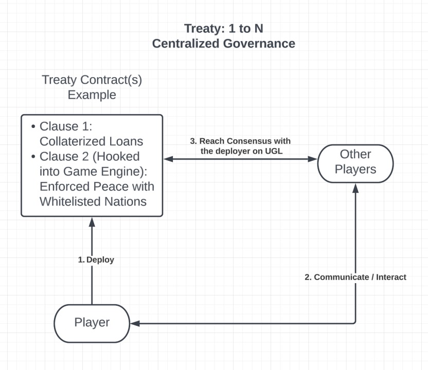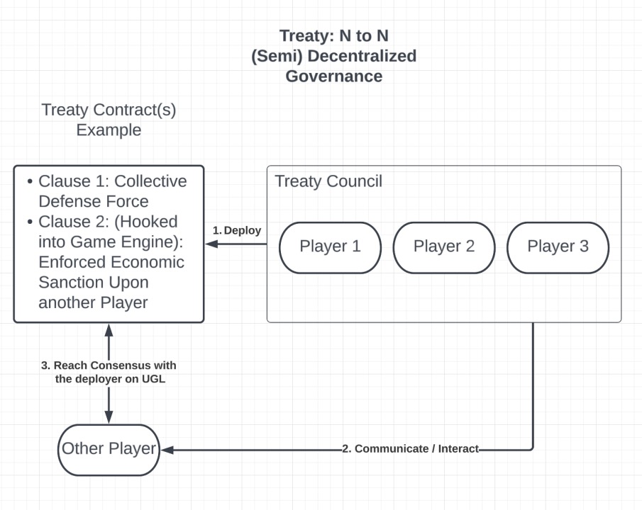 玩家也可以在他们的UGL中实现基于投票的DAO。在经济制裁条约的情况下,条约理事会的成员国可以相互达成协议,并就制裁规则进行投票,例如针对哪些国家。条约规则将在核心游戏的转移功能中强制执行。与1-N模式类似,外部的任何人都不会受到影响,从而使条约具有最大的灵活性。