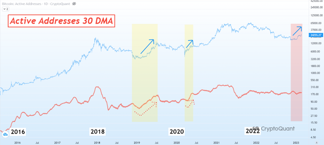 在可能是下一个比特币牛市模式缺乏力量的迹象中,链上数据显示了与以往BTC突破的有趣对比。与之前牛市周期的开始不同,当前周期实际上没有足够的基于 30 天移动平均线的活跃地址,或者它们的上升,以证明价格在上升曲线中移动是合理的。根据 Crypto Quant 数据显示,活跃的比特币地址数量没有真正增长。