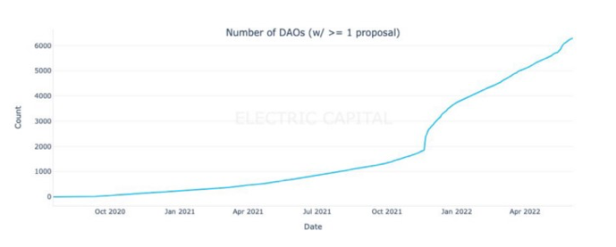 在过去一年内,DAO增长了将近9倍。DAO 的数量(定义:对Snapshot 上的至少一项提案进行投票)已从 2021 年 5 月的 700 个增加到 2022 年 6 月的 6000 多个。