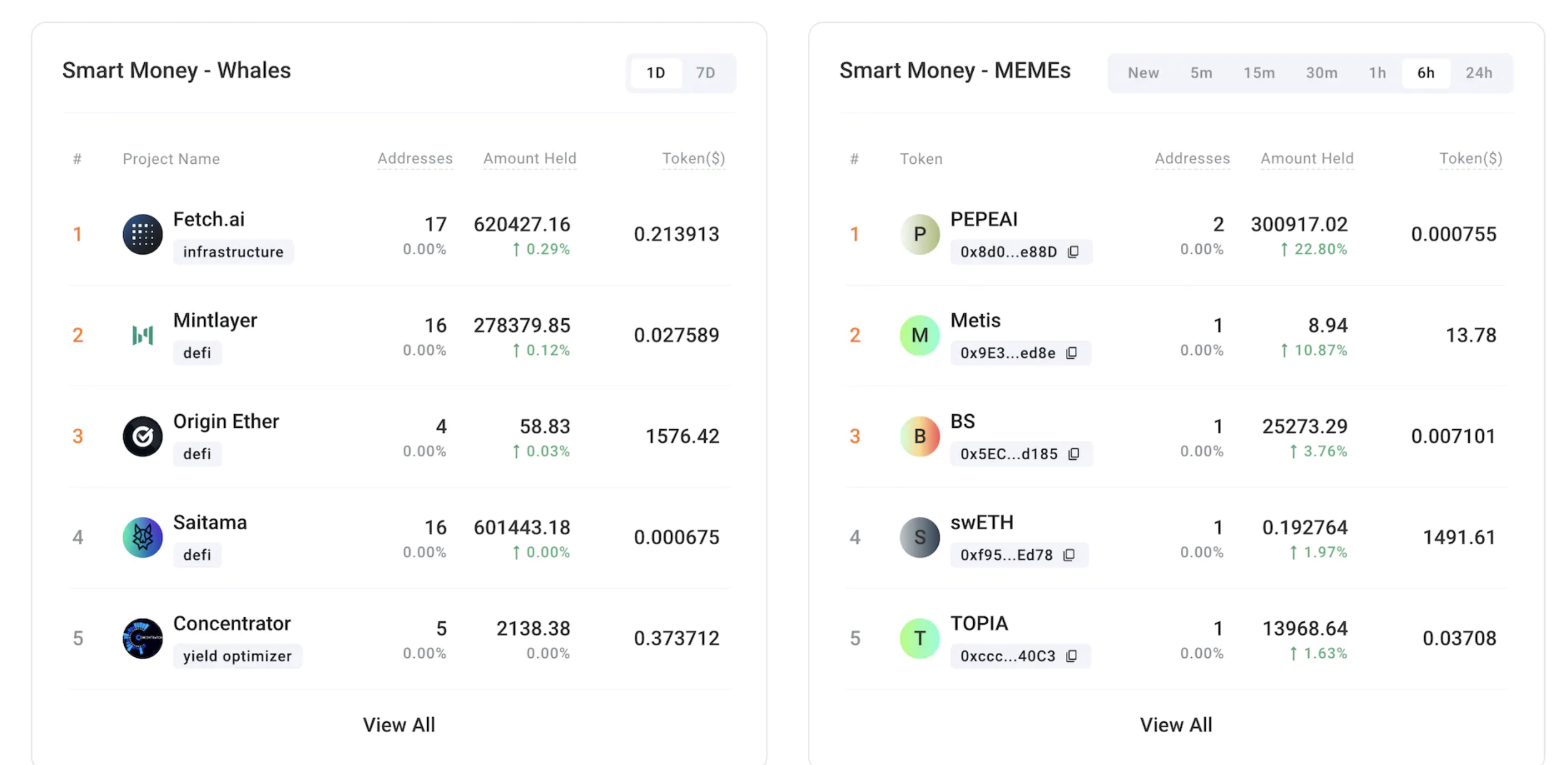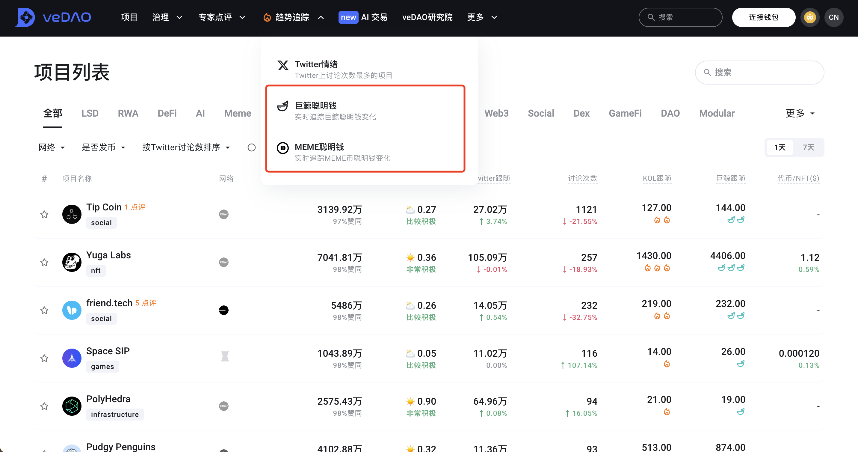 veDAO的聪明钱分为巨鲸聪明钱和MEME聪明钱,巨鲸聪明钱实时追踪巨鲸聪明钱群体行为变化;MEME聪明钱实时追踪MEME币聪明钱群体行为变化。