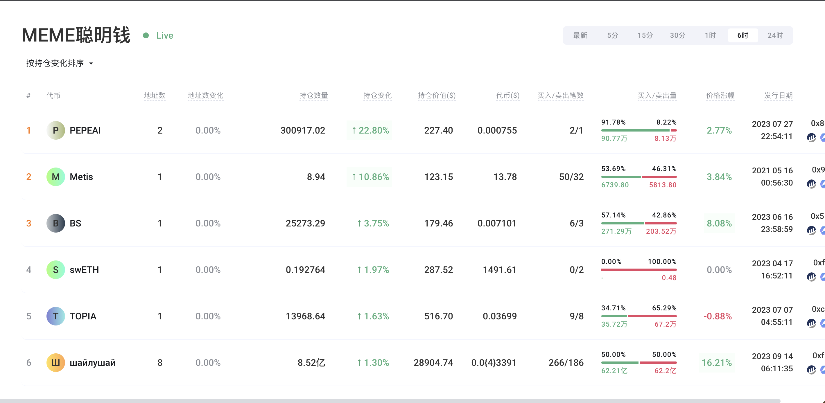MEME聪明钱的详情页的存量和增量指标基本和巨鲸聪明钱一致,这里不多做介绍,有兴趣的用户可以去深入体验,不同之处在进行基于增量筛选时其周期选择更多。