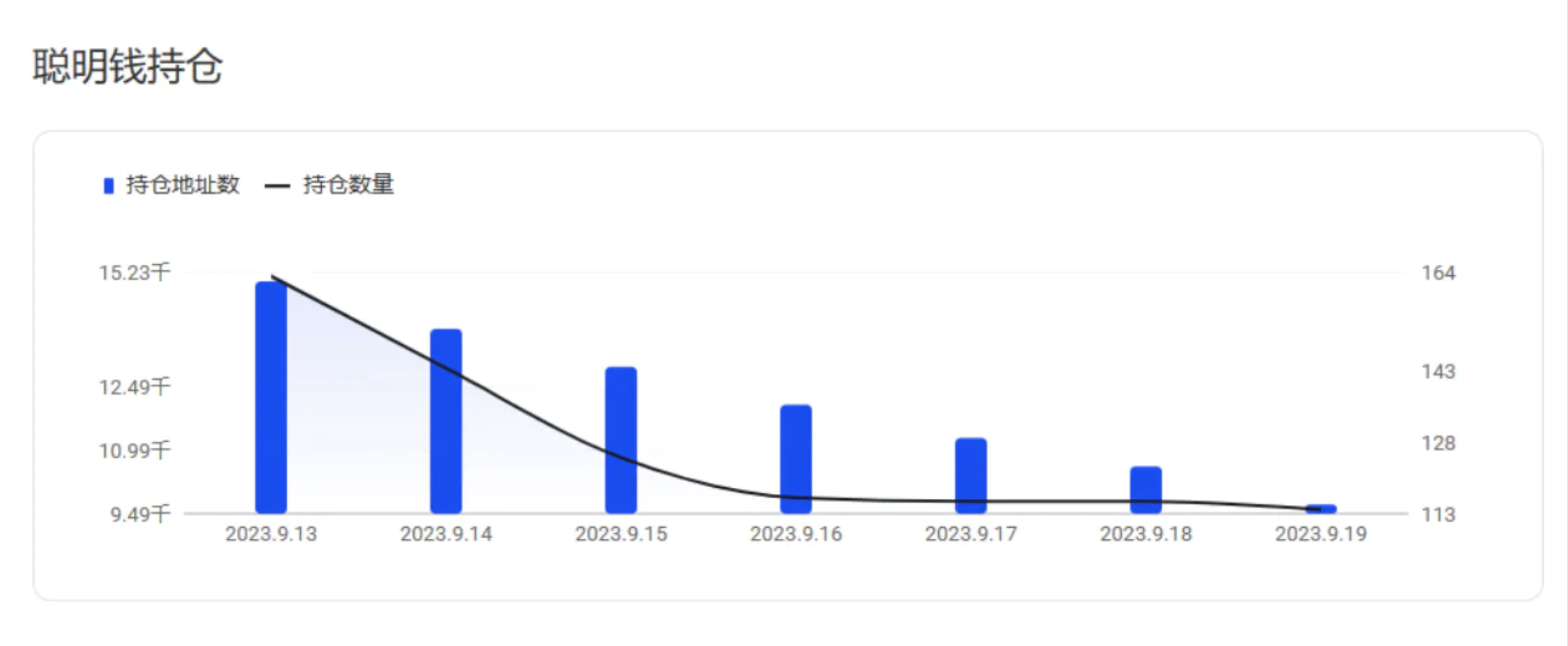 点击具体聪明钱持有的项目,进入项目的详情页,可以看到聪明钱群体持仓地址数和持仓数量的历史数据变化趋势图,通过数据可视化的方式,呈现持仓地址数和持仓数量的历史变化趋势;通过持仓地址数和持仓数量指标曲线和柱状图的平滑程度和总体变化趋势,呈现持仓地址数和持仓数量指标是否异常和指标的总体变化趋势。从而进一步判断该异常是否在合理的范围之内;另外一方面,判断该异常是否具有周期性的特征。同时,历史数据变化趋势图,也可以用于进行趋势预测。