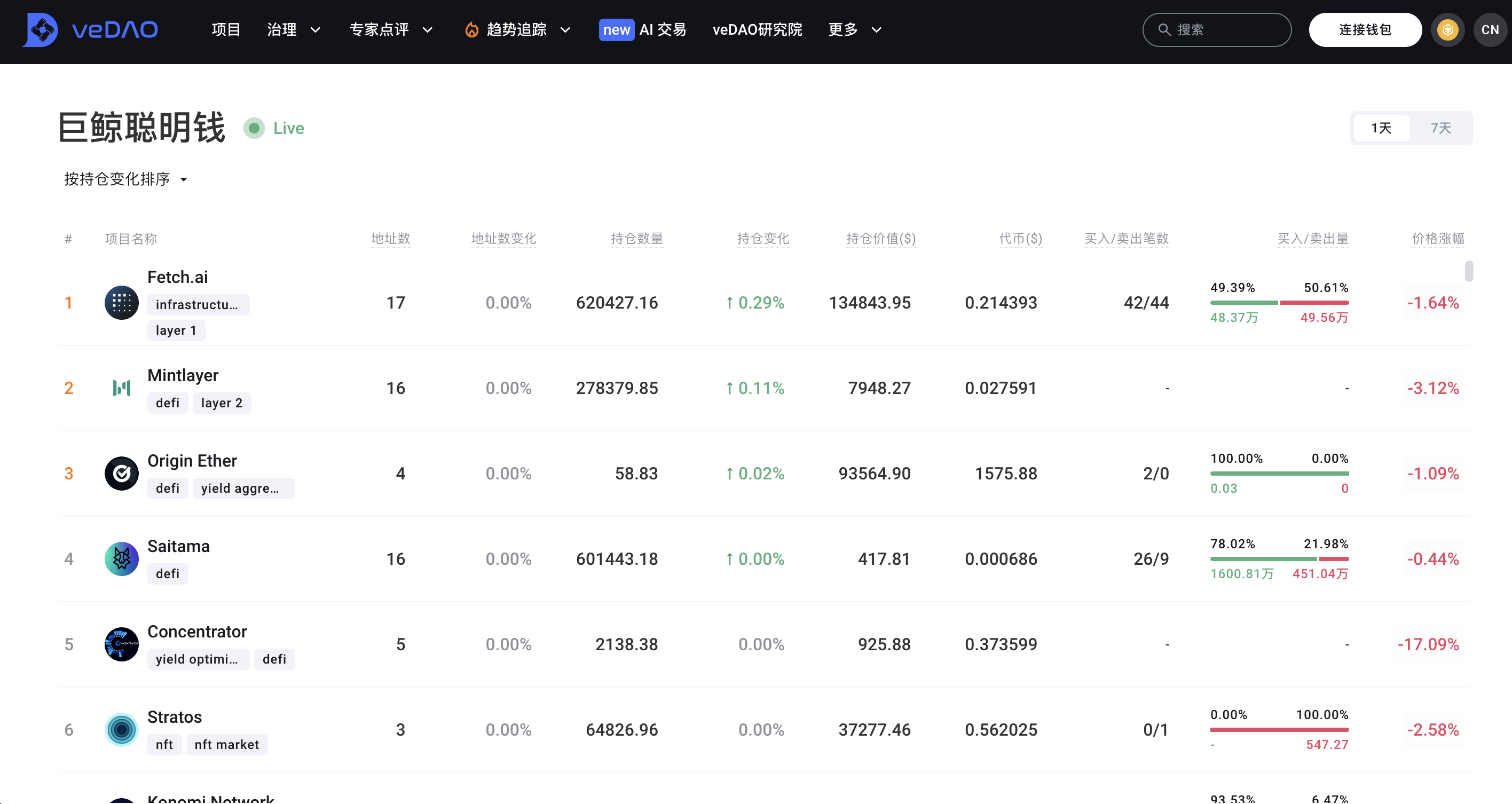 综上所述,在AI到来的大环境下,充分运用各种智能工具和平台,来赋能自己的投资策略,将会在未来成为一种常态。投资者将摆脱无意义的手动数据整理和分析的过程,而是依靠更加智能的工具来帮你将你想要的数据和维度展现出来。veDAO的聪明钱功能就在做这样的事情。基于veDAO,你可以找到任何你想参考的数据,同时AI智能投资顾问也会帮你去做分析,辅助你的决策,最终实现,精准捕获Alpha,一键投资,从容获利。