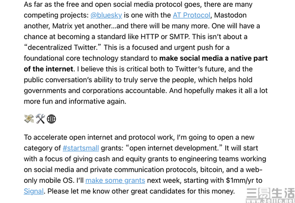 事实上这也不难理解,在多西回归推特的几年时间里,他曾非常激进地在推特上推出了一系列利好Web3和加密货币的措施,比如为Web3从业者开辟了“Twitter Space”在线音频聊天室,支持推特的用户头像使用NFT、并给予认证等。而在日前其回应“推特文件门”一事的文章中,他也再次提及了自己牵头的“蓝天”,以及“长毛象”(Mastodon)和Matrix,这些无一不是采取去中心化结构的项目。