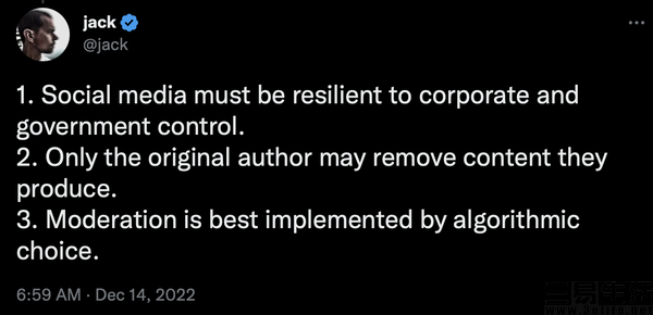 随着此事的发酵,“置身事外”的杰克·多西也在推特发布了长文,并在开头就坦言,“推特这家曾由他管理的公司,在当时和现在都存在严重的问题”,并且对他一直信奉的三个原则,推特从始至终也未能满足。