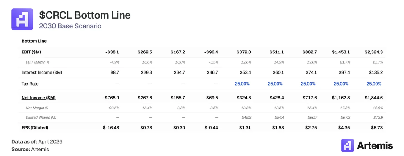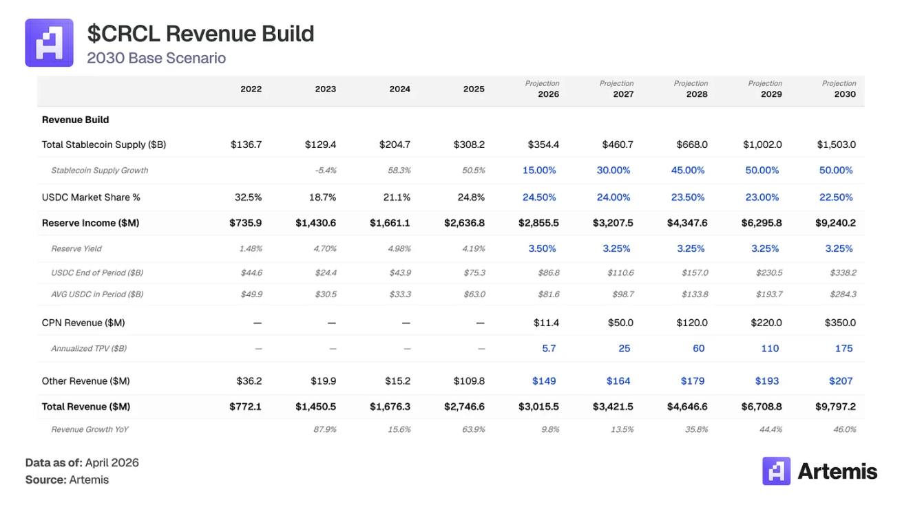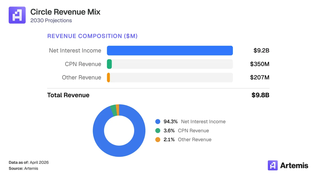 市场将 Circle 定价为利率敏感的货币市场基金——押注美联储基金利率坐在区块链轨道上。我们认为这一框架错误定价了业务。USDC 供应量在 2025 年增长 72% 至 753 亿美元,即使美联储在下半年降息 75 个基点,表明 USDC 需求由真实效用采用驱动,而非纯粹的收益率寻求行为。我们的基准情况预测到 2030 年稳定币总市场达到约 1.5 万亿美元,USDC 平均供应量为 2840 亿美元。即使储备收益率预计压缩,我们预计 Circle 的储备收入将在 2030 年增长至 92 亿美元(较 2025 年约 3.5 倍),因为供应量增长压倒了利率压缩。结合 Circle 支付网络(CPN)扩展至 3.5 亿美元收入,分销成本从 60% 降至 55%,我们的基准情况预测 2030 年总收入 98 亿美元,净收入约 18 亿美元。