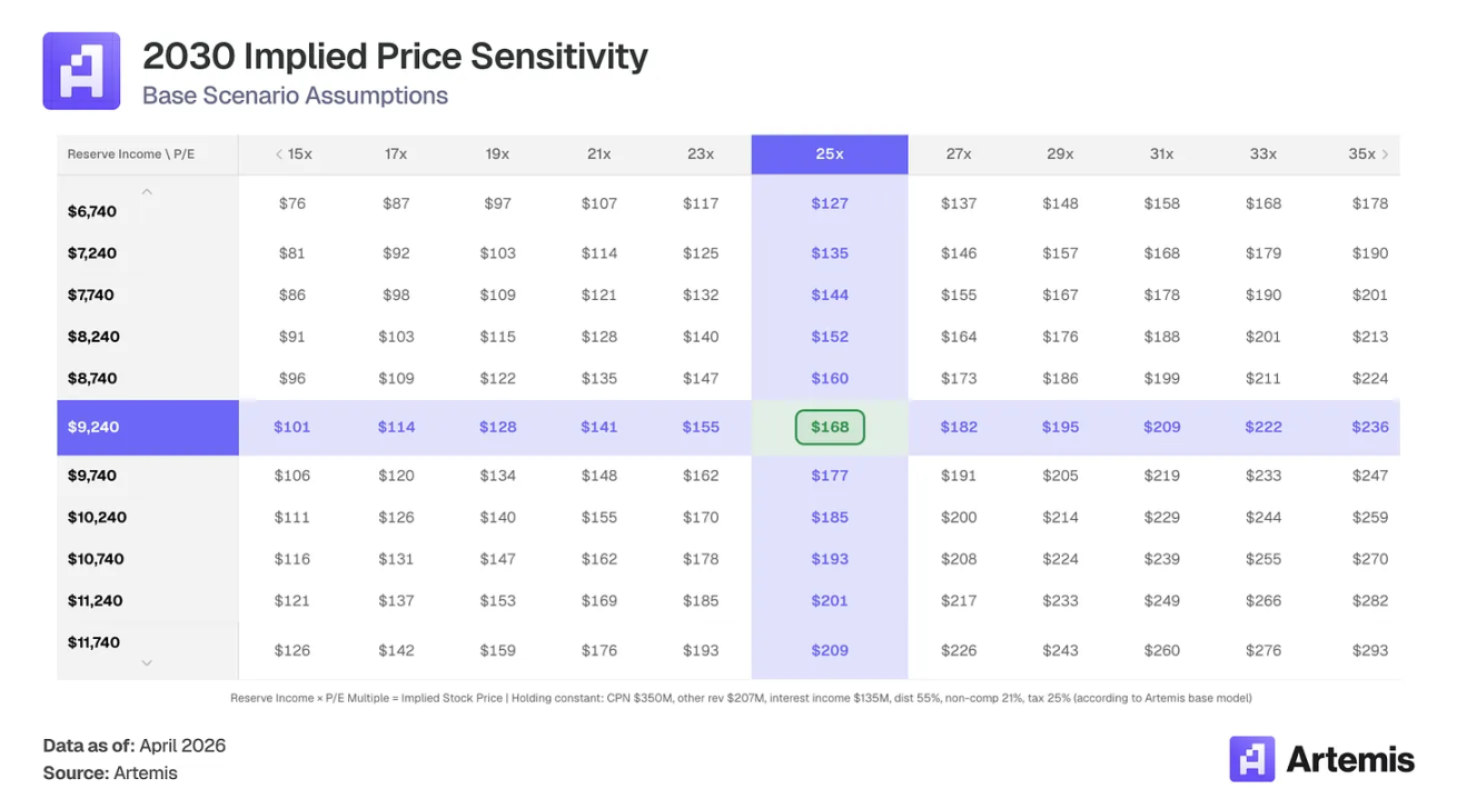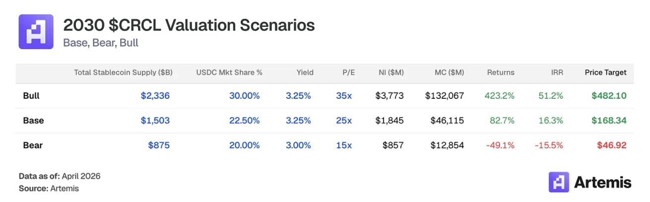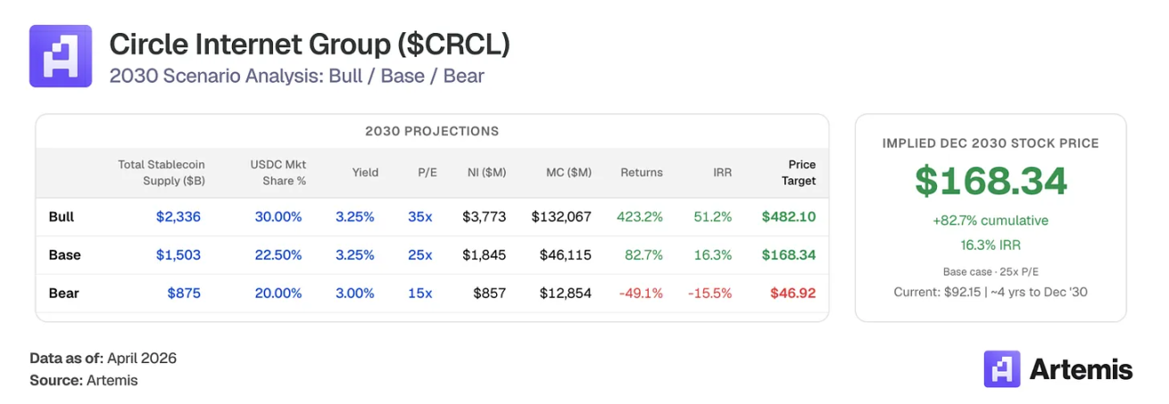 基准情况:假设供应量增长和 CPN 扩展持续执行,稳定币市场达到 1.5 万亿美元,USDC 维持 22.5% 份额。分销成本适度降至 55%,因为新金融机构合作伙伴谈判较低收入份额。以 2030 年预测收益的 25 倍终端市盈率退出,意味着目标价 168.34 美元——82.7% 上涨空间,16.3% 内部收益率。