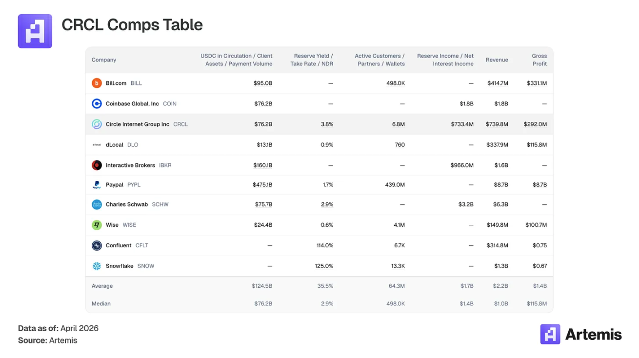 没有直接的上市可比公司作为通过储备浮存金变现的稳定币发行方。我们的可比集合涵盖与 Circle 业务共享关键属性的公司:基于浮存金的收入模式(嘉信理财、盈透证券),数字支付基础设施(PayPal、Wise、dLocal、Bill.com),加密原生平台(Coinbase),以及具有基于使用量经济学的高增长基础设施(Snowflake、Confluent)。