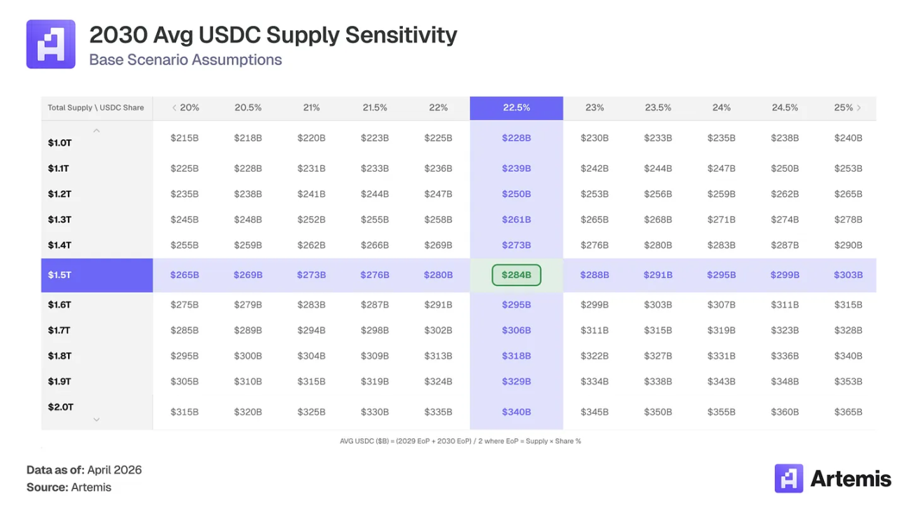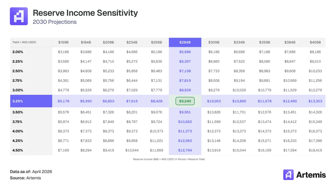 缓解因素:即使在 2.5% 收益率下,2840 亿美元平均 USDC 产生 71 亿美元储备收入,仍是 2025 年 4.19% 收益率下赚取的 26.4 亿美元的 2.7 倍。供应量增长压倒了除最极端利率情景之外的所有情况。