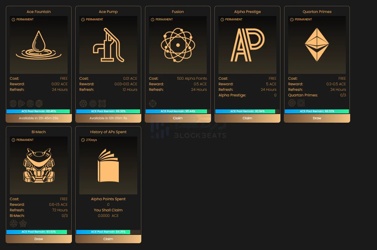 该交互面向 Alpha Prestige 持有者。刷新时间为 24 小时。每次奖励 5 ACE。对于单地址持有多个 Alpha Prestige 的持有者,可获得相应的奖励倍数,无叠加上限。
