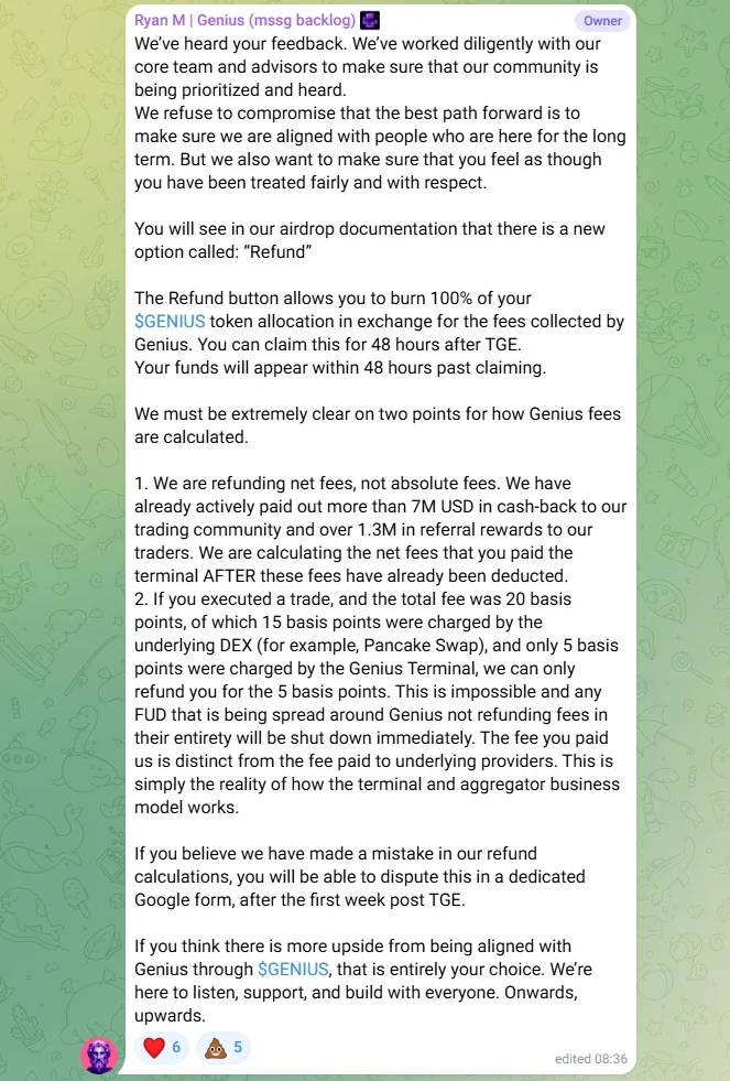 从公布空投规则后,Genius 社区中充满了不满情绪。今晨,团队听取社区意见后,在 Telegarm 官方频道发文表示,空投领取时会增加一个「退款」选项,选择退款,意味着销毁 100% 的 GENIUS 代币空投额度以换取 Genius 收取的手续费,用户可以在 TGE 结束后 48 小时内申请退款,并且退款将在申领后 48 小时内到账。此外,关于 Genius 手续费的计算方式,用户需要了解以下两点: