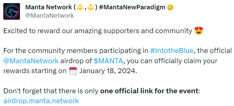 近期,Manta Network在X平台发文表示,Into the Blue空投于1月18日开放领取。