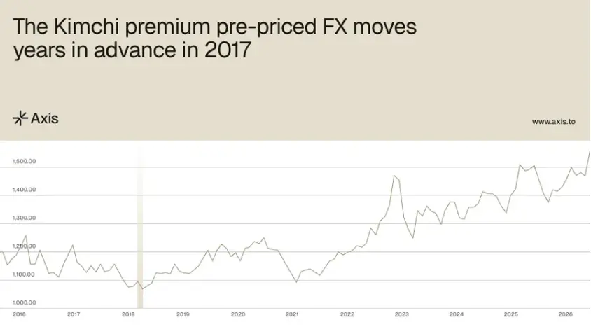历史数据让这一点具象化。回顾 2017 年,当美元兑韩元(USD/KRW)汇率约为 1060 时,“泡菜溢价”一度飙升至 40% 的峰值,这意味着其实际上的 USDT/KRW 隐含汇率已高达 1480 左右。到了 2024 年 12 月,现实中的美元兑韩元汇率确实突破了 1480。换言之,该溢价提前数年对这一外汇走势进行了预先定价。这些信号早已深藏于公开可见的数据之中,但唯有依托韩国本土的资讯渠道,方能对其做出准确的解读。