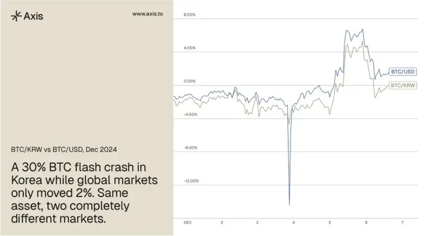 有史以来最明显的例证发生在 2024 年 12 月 3 日,当时韩国总统尹锡悦宣布戒严。受此国内政治突发事件的单一冲击,韩国市场的 BTC 价格盘中暴跌约 30%,而同期全球市场的跌幅仅为 2% 左右 — — 两者之间存在着高达 28 个百分点的惊人价差。这场抛售潮的总规模约达 333 亿美元,并使得韩国本土市场一度创下全球最高交易量的记录。