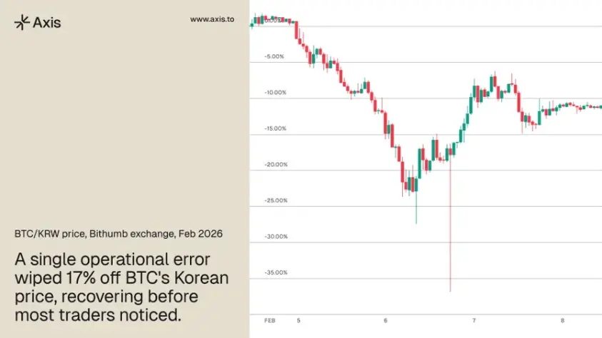 处罚公告发布后,资金开始迅速向 Upbit 迁徙,进一步加剧了市场的集中度。2026 年 2 月,Bithumb 发生了一起严重的运营失误,误将 620,000 枚 BTC 记入用户账户,这直接导致 BTC/KRW 交易对在价格回升前遭遇了 17% 的闪崩。这段插曲生动地展示了:当价格发现机制高度依赖于一家处于高压环境下的单一平台时,市场将会呈现何种极端状况。