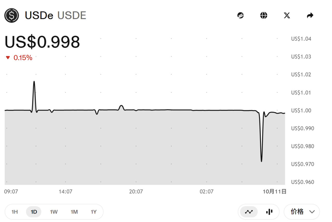 今日凌晨 5 时许,USDe 一度大幅下跌至 0.65 美元,随后快速恢复至 0.99 美元以上。USDe 的大幅脱锚定,也是市场币价暴跌的重要因素之一。